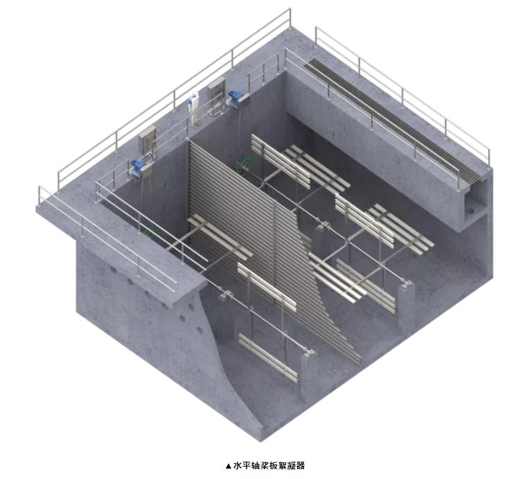 (1)水平軸槳板絮凝器 通常認為,水平軸槳板絮凝器是大型水處理廠中最具成本效益的絮凝器。因為允許單個驅動器為多個水平軸提供能量,這樣可以顯著地降低設備投入成本。有些廠家對此類產品進行了升級,包括:關鍵組件使用不銹鋼材質(比如槳葉和鏈條等),專有的校平裝置,自動調心聯軸器和特種軸承襯套、有免維護塑料制造的水下軸承等,盡可能最大程度地減少停機時間,而且使用新型軸承可以延長這種絮凝器的使用壽命,并降低維護成本。