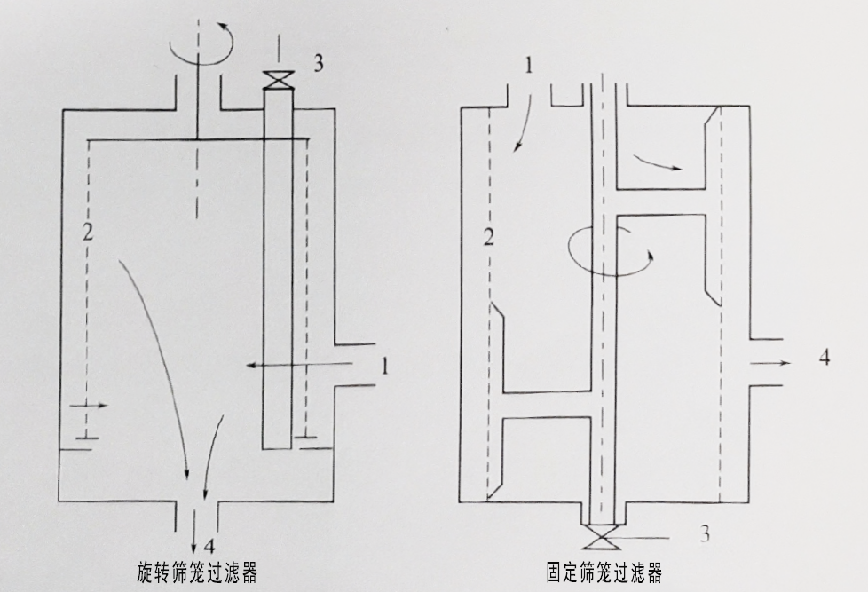 圖4 不同類型的壓力式機械過濾 1——原水進水口;2——濾網;3——污泥;4——濾后水出口 |