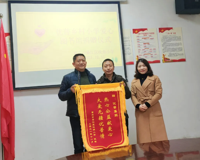 2021年12月15日,優普援建的第十一所鄉村小學愛心圖書館,在重慶綦江區打通鎮吹角小學落成。經董事長詹偉先生授權,副總裁陸剛先生率人力資源總監余海英女士、《優普視界》編輯羅湘峰先生、人事主管李婷女士等趕赴現場,與校方負責人一同出席了掛牌儀式。