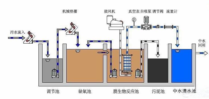 膜生物反應(yīng)器(MBR)是在廢水工程中應(yīng)用較成熟的處理技術(shù)。簡單地說是利用纖維膜或平板膜組件直接將曝氣池進(jìn)行泥水分離,利用膜的選擇透過性實現(xiàn)曝氣池中的生物富集,使得生物處理效率大幅度提高,生物處理后的污水再經(jīng)膜分離后得到潔凈的回用水。它是保護(hù)水環(huán)境,實現(xiàn)污水資源化的一項重要技術(shù),MBR技術(shù)是目前公認(rèn)的最有發(fā)展前途的環(huán)境治理技術(shù)之一,也是處理高濃度廢水和污水中水回用的理想技術(shù)。 1 MBR工藝應(yīng)用實例 湖北某食品原料廠的廢水屬于中高濃度有機(jī)廢水,水量為145 m3 /d,進(jìn)水CODcr為7300 mg/L,現(xiàn)在需將其處理使之滿足中水回用標(biāo)準(zhǔn),再將中水回用于廠區(qū)內(nèi)的綠地澆水使用。 1.1 工藝設(shè)計參數(shù) 工藝設(shè)計水質(zhì)水量如表1所示。 1.2 工藝流程圖