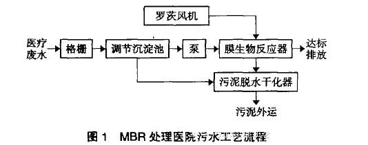 2.2 工藝流程 本醫院污水處理工程采用先進的膜生物反應器(MBR)工藝,每天連續運行24h,其工藝流程如圖1。醫療污水先經格柵隔除大顆粒的飄浮物及雜物,進入調節沉淀池,在調節沉淀池中,大部分懸浮物被沉淀下來,沉積在池內的泥斗中,由設在操作間內的污泥提升泵泵至污泥脫水干化器與膜生物反應器產生的污泥一起脫水處理。 調節沉淀池內設潛水式污水泵,污水泵由集水池內的液位控制器根據池內的液位來控制,保證污水處理系統的連續運行。污水經沉淀及水質水量調節后,由潛水泵泵至膜生物反應器,污水中的有機物經過生物反應器內微生物的降解作用,使水質得到凈化,膜生物反應器所需的氧氣由羅茨風機提供。而膜的作用主要是將活性污泥與大分子有機物及細菌等截留于反應器內,使出水水質達到外排要求,同時保持反應器內有較高的污泥濃度,加速生化反應的進行,最后由膜生物反應器出來的水可達標直接排放。沉淀下來的污泥由污泥泵提升至污泥脫水干化器,最后污泥外運。
