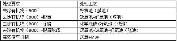 常規MBR 污水處理工藝說明: (1)格柵 廢水通過格柵,利用機械格柵去除大塊雜物、漂浮物等,避免對后續設備的影響。在格柵井內安裝一套機械格柵,柵條間隙為1-2mm,由進水室、格柵渠道組成。在格柵進水室設置應急溢流管,當設備故障或其他非常原因,使進水室的污水超過最高設定水位時,污水通過應急溢流管超越排出,為檢修,在格柵前設置圓形閘閥。柵渣需定期清理,可作垃圾處理。 (2)調節池 來自各時的水質、水量均不一樣,一般高峰流量為平均處理量的2~8倍,因此為使處理系統連續穩定地運行,同時調節水量和均和水質,設計一座調節池。調節池的設計有效容積一般為平均處理量的4~12倍,為保證調節池內不沉積污物,設置潛水攪拌器進行攪拌。設置液位自動控制裝置,水泵將根據液位自動開啟;設置潛污泵提升污水至缺氧池,配套自動耦合起吊裝置。 (3)缺氧池 污水進入缺氧池,同時進入的還有膜池的回流混合液和污泥池的污泥。缺氧池主要作用是依靠污水中的有機物為碳源,利用反硝化細菌的反硝化作用將回流至該池泥水混合物中的硝酸鹽、亞硝酸鹽轉化為氮氣,從而實現廢水脫氮。此外,由于在脫氮過程中也消耗了污水中的有機物,所以廢水COD同時降低。池內設潛水攪拌器,溶解氧濃度為0.5mg/L。 (4)好氧池 經缺氧池處理后,自流進入好氧池,即進入好氧處理階段。在曝氣狀態下中大量繁殖的活性污泥中微生物以及硝化菌群、磷細菌,降解或吸附水中含碳、氨氮、磷有機污染物質,以達到凈化水質的目的。池內設置硅橡膠管式曝氣器,具有良好的氧轉移率。控制溶解氧濃度2.0mg/L。 池采用鼓風曝氣方式。傳統地埋式常用潛流曝氣方式,但運行發現當停止曝氣時,污泥沉淀至曝氣口附近而造成曝氣口堵塞現象,使曝氣機難以啟動,甚至完全不能啟動;同時,由于潛流曝氣設備埋設于地下,造成維修更換困難,給正常運行造成很大的麻煩。所以本設計采用羅茨鼓風機進行鼓風曝氣,安裝由管道組成的曝氣系統,不易堵塞,風機設在設備房,維修更換方便。 (5)MBR池 利用膜對生化反應池內的含泥污水進行過濾,實現泥水分離。一方面,膜截留了反應池中的微生物,使池中的活性污泥濃度大增加,使降解污水的生化反應進行得更迅速更徹底;另一方面,由于膜的高過濾精度,保證了出水清澈透明,得到高質量的產水。 膜池設置MBR膜組件系統及配套的出水、清洗、吹掃等系統。MBR膜區內的吹掃(曝氣)有兩個用途,一是用于膜組件周圍的氣水振蕩,保持膜表面清潔,二是為提供生物降解所需要的氧氣。通過膜的高效截留作用,全部細菌及懸浮物均被截流在曝氣池中,可以有效截留硝化菌,使硝化反應順利進行,有效去除氨氮;同時可以截留難于降解的大分子有機物,延長其在反應器中的停留時間,使之得到最大限度的降解。剩余污泥通過膜區剩余污泥泵定期排出,可控制系統內活性污泥的濃度及污泥齡。 (6)消毒/清水池 經膜過濾的出水尚有一部分病毒不能被去除,出水再經消毒即可達標回用。可采用紫外消毒,消毒后的水儲存在清水池內供使用,預留取水泵位置。 MBR 系統實現從水中去除有機物(COD)、氨氮(NH3-H)、總氮(TN)和總磷(TP)。用戶可根據出水要求,組合厭氧、缺氧、好氧工藝,實現對出水的要求。 以下是本公司針對不同水處理要求所建議的處理工藝,如表3-1 所示: