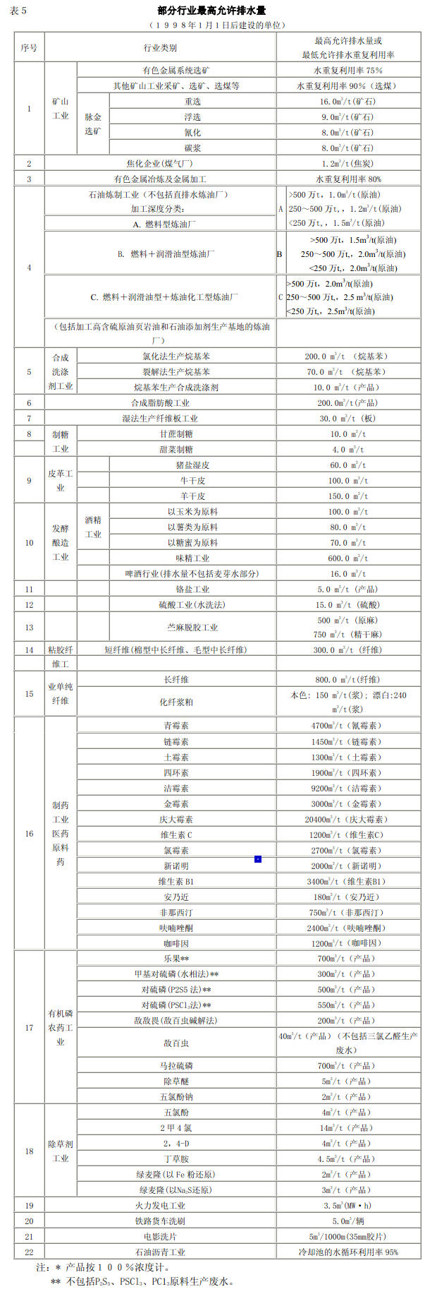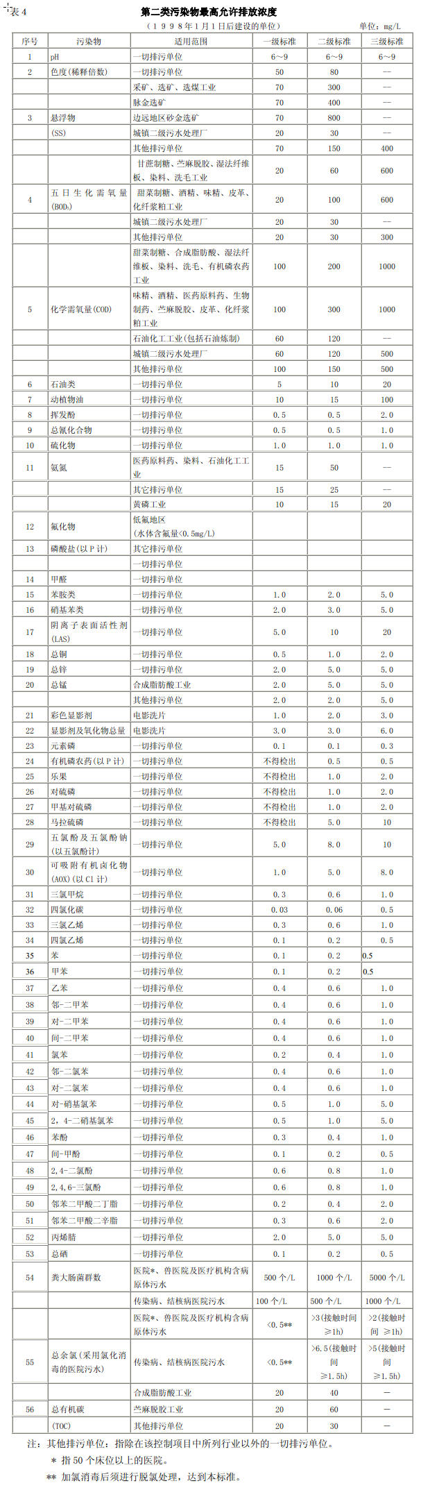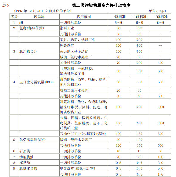 4.2.2 本標準按年限規定了第一類污染物和第二類污染物最高允許排放濃度及部分行業最高允許排水量,分別為:
