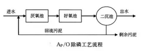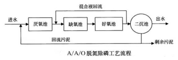 在AN/O工藝流程中, 原污水先進入缺氧池,再進入好氧池,并將好氧池的混合液與沉淀池的污泥同時回流到缺氧池。污泥和好氧池混合液的回流保證了缺氧池和好氧池中有足夠數(shù)量的微生物,并使缺氧池得到好氧池中硝化產(chǎn)生的硝酸鹽。 而原污水和混合液的直接進入,又為缺氧池反硝化提供了充足的碳源有機物,使反硝化反應(yīng)能在缺氧池中得以進行。反硝化反應(yīng)后的出水又可在好氧池中進行BOD的進一步降解和硝化作用。 為了達到同時脫氨除磷的目的,在Ap/O工藝中增設(shè)缺氧區(qū),構(gòu)造了厭氧/缺氧/好氧(A/A/O) 工藝。 (A/A/O)脫氮除磷工藝流程: