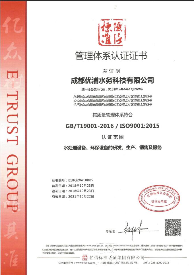 2018年10月23日,成都優(yōu)浦水務(wù)科技有限公司順利通過了ISO9001:2015質(zhì)量管理體系認(rèn)證。 從申報(bào)、提交材料、審查認(rèn)定,再到發(fā)放證書等,優(yōu)浦水務(wù)經(jīng)過認(rèn)證專家的嚴(yán)格仔細(xì)的考量,最終確認(rèn)我們公司質(zhì)量管理符合ISO9001:2015的標(biāo)準(zhǔn)要求,并與2018年10月23日,向我們公司正式頒發(fā)了ISO9001:2015質(zhì)量管理體系證書。 本次認(rèn)證涵蓋了優(yōu)浦公司水處理設(shè)備、環(huán)保設(shè)備的研發(fā)、生產(chǎn)、銷售、及服務(wù)相關(guān)管理的全過程,確保所有生產(chǎn)都符合質(zhì)量管理體系相關(guān)法律法規(guī)的要求。本次能夠順利通過管理體系認(rèn)證,也是因?yàn)楣竟芾碚邔?duì)于公司產(chǎn)品質(zhì)量的高度重視,今日我們也將嚴(yán)格按照質(zhì)量管理體系的要求,保質(zhì)保量生產(chǎn)。
