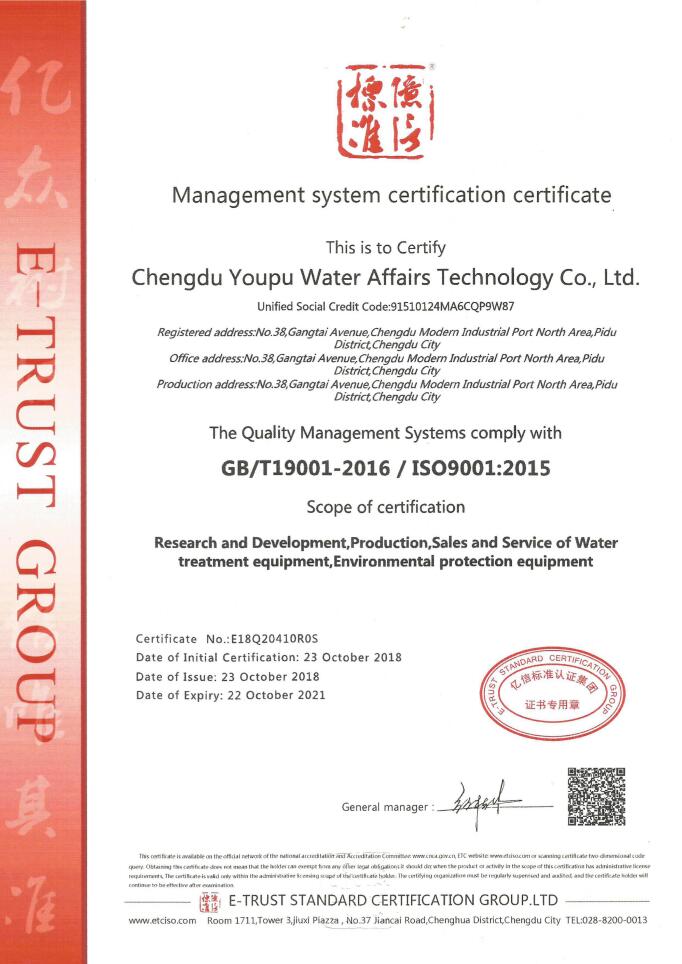 | 熱烈祝賀優(yōu)浦水務(wù)通過ISO9001:2015質(zhì)量體系管理認(rèn)證 |