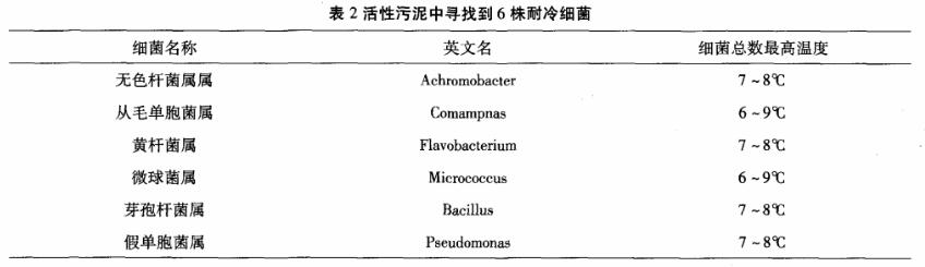 1.2耐冷細菌的生長溫度研究 自然界中多數微生物的生長溫度介于2~40℃,而微生物的最適溫度為25~37℃,微生物的最低生存繁殖溫度通常為10℃,即10℃溫度以下是大多數微生物耐低溫極限。在中國北方的冬季水處理運行設施的水溫一般低于10℃。在此條件下,溫度已經下降到微生物活性最低的臨界狀態,廢水中的有機污染降很難被降解。在低溫下,在污水處理中低溫微生物的正常生長和代謝起著很大作用。然而,低溫環境下微生物的生長速率低,微生物更新世代時間更長,在炎熱的夏季,當溫度逐漸升高是,竟爭性中溫微生物抑制低溫細菌生長,因此,在冬季微生物在廢水處理中數量很低,活性不高,從而在處理廢水中效率低。