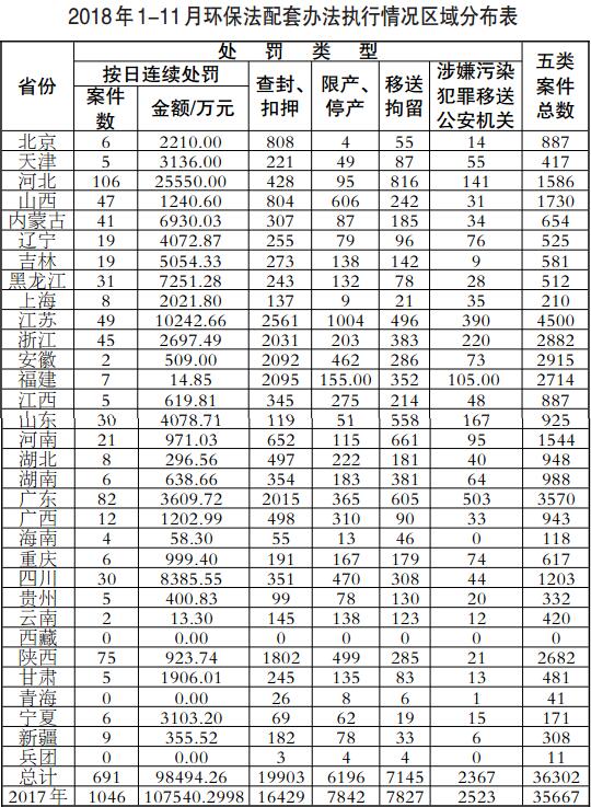 生態(tài)環(huán)境部今日向媒體通報(bào)各地2018年1月-11月環(huán)境行政處罰案件與《環(huán)境保護(hù)法》配套辦法的執(zhí)行情況。 2018年1月-11月,全國(guó)環(huán)境行政處罰案件共下達(dá)處罰決定書166210份,罰沒款金額為135.97億元。行政處罰力度較大的省份為:江蘇、廣東、河北、山東、浙江。其中,江蘇(19.73億元)、廣東(15.37億元)、河北(12.53億元)、山東(10.25億元)罰沒款金額超10億元。 1月-11月,全國(guó)行政處罰案件數(shù)量排名前十的地市為:廣州市、石家莊市、東莞市、蘇州市、深圳市、邯鄲市、濰坊市、成都市、佛山市、無(wú)錫市;行政處罰金額排名前十的地市為:唐山市、蘇州市、深圳市、無(wú)錫市、廣州市、南通市、徐州市、東莞市、石家莊市、佛山市。 1月-11月,行政處罰案件數(shù)量排名前十的縣(市、區(qū))為:廣州白云區(qū)、佛山順德區(qū)、濰坊壽光市、天津武清區(qū)、廣州增城區(qū)、無(wú)錫江陰市、北京大興區(qū)、蘇州吳江區(qū)、深圳寶安區(qū)、北京房山區(qū);行政處罰金額排名前十的縣(市、區(qū))為:唐山遷安市、深圳寶安區(qū)、佛山順德區(qū)、無(wú)錫江陰市、上海崇明區(qū)、淄博臨淄區(qū)、常州武進(jìn)區(qū)、泰州泰興市、蘇州昆山市、廣州增城區(qū)。 1月-11月,全國(guó)實(shí)施五類案件總數(shù)為36302件,比去年同期(35667件)增長(zhǎng)1.78%。其中,按日連續(xù)處罰案件691件,比去年同期(1046件)減少33.94%,罰款金額9.85億元,比去年同期(10.75億元)減少8.41%;查封、扣押案件19903件,比去年同期(16429件)增長(zhǎng)21.15%;限產(chǎn)、停產(chǎn)案件6196件,比去年同期(7842件)減少20.99%;移送行政拘留7145起,比去年同期(7827件)減少8.71%;移送涉嫌環(huán)境污染犯罪案件2367,與去年同期(2523件)減少6.18%。 《環(huán)境保護(hù)法》配套辦法案件數(shù)量較多的為江蘇、廣東、安徽、浙江、福建、陜西六省。案件數(shù)量與去年同期相比上升明顯的為重慶(109.15%)、廣西(95.24%)、天津(66.80%)、海南(42.17%)、陜西(35.45%)、內(nèi)蒙古(35.40%)六省(區(qū)、市)。 1月-11月,配套辦法案件數(shù)量排名前十的地市為:臺(tái)州市、廣州市、呂梁市、西安市、徐州市、無(wú)錫市、泉州市、寧波市、合肥市、蘇州市。 截至11月底,全國(guó)所有地市均有適用《環(huán)境保護(hù)法》配套辦法的案件。 1月-11月,配套辦法案件數(shù)量排名前十的縣(市、區(qū))為:廣州白云區(qū)、阜陽(yáng)臨泉縣、合肥長(zhǎng)豐縣、泉州晉江市、深圳龍華新區(qū)、西安鄠邑區(qū)、呂梁交城縣、常州武進(jìn)區(qū)、徐州豐縣、連云港贛榆區(qū)。 截至11月底,有118個(gè)縣(市、區(qū))沒有適用配套辦法案件。零案件縣(市、區(qū))較多的省份為山東、湖北、湖南三省。(文章來源于中國(guó)環(huán)境網(wǎng))