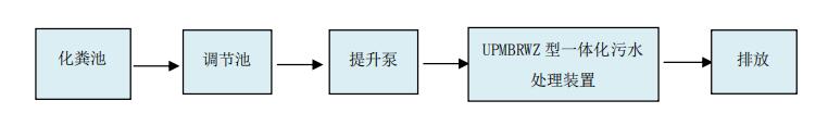 污水由化糞池提升至一體化設備,一體化設備包括A 區、O區、MBR反應區、清水區和設備間,原水首先進入A區,在兼氧狀態下進行脫氮,反硝化菌利用污水中的有機物作為碳源,將膜池回流污泥中帶入的大量NO3和NO2還原為N2并釋放到空氣中,BOD濃度繼續下降,NO3濃度也大幅度下降。其次,在好氧區內在曝氣狀態下大量繁殖的活性污泥中微生物以及硝化菌群、磷細菌可以降解或吸附水中含碳、氨氮、磷有機污染物質,再進入MBR膜反應器中以達到凈化水質的目的。 膜生物反應器(簡稱MBR工藝)是利用膜取代二沉池對生化工藝的泥水混合物進行固液分離,它使用開放式中空纖維膜元件,將膜直接置于好氧池中,通過泵的負壓抽吸,利用大氣壓力,使水透過膜表面,從中空纖維膜內側抽出,達到過濾凈化的目的。 MBR污水處理的運行流程見下圖: